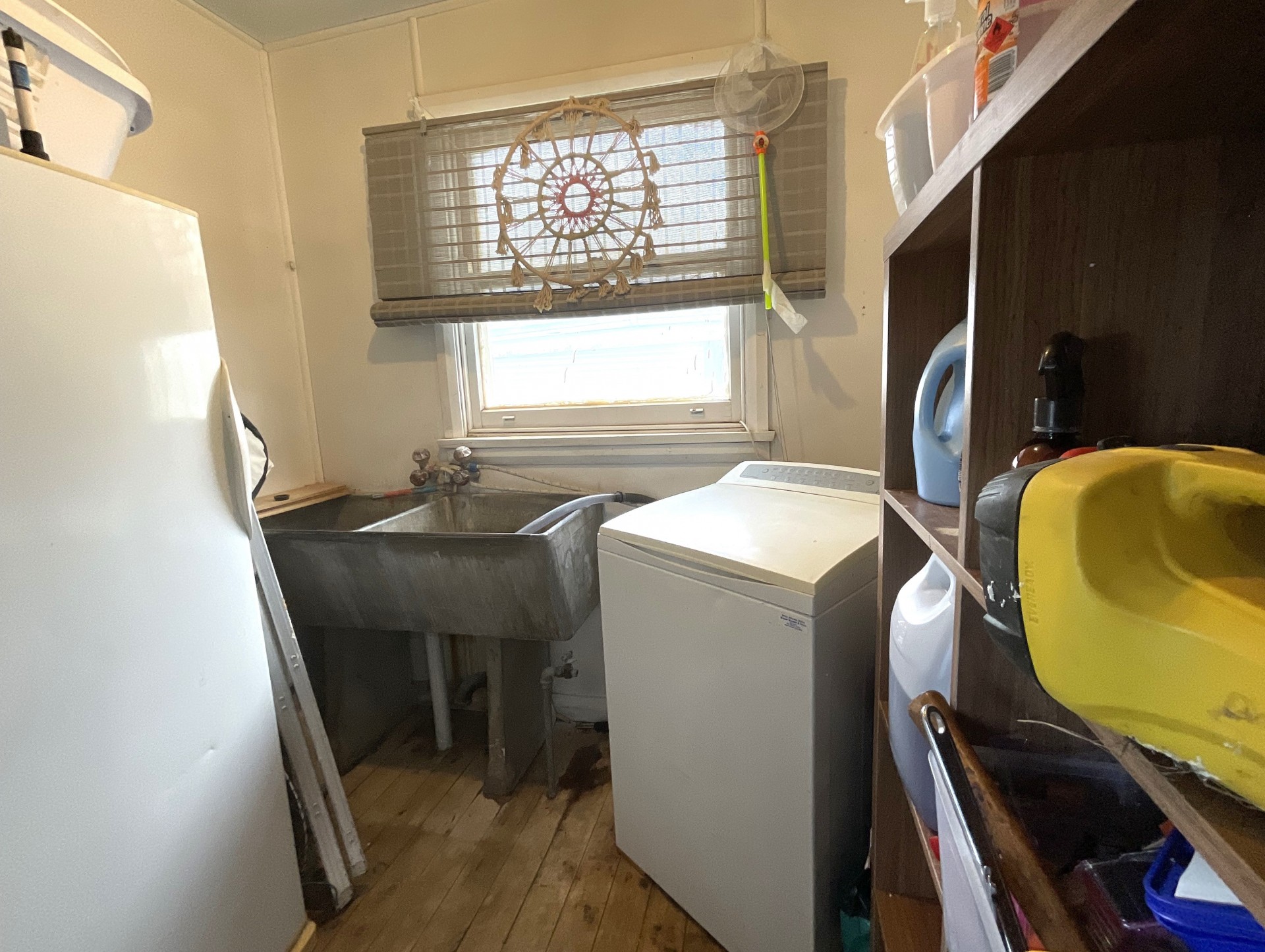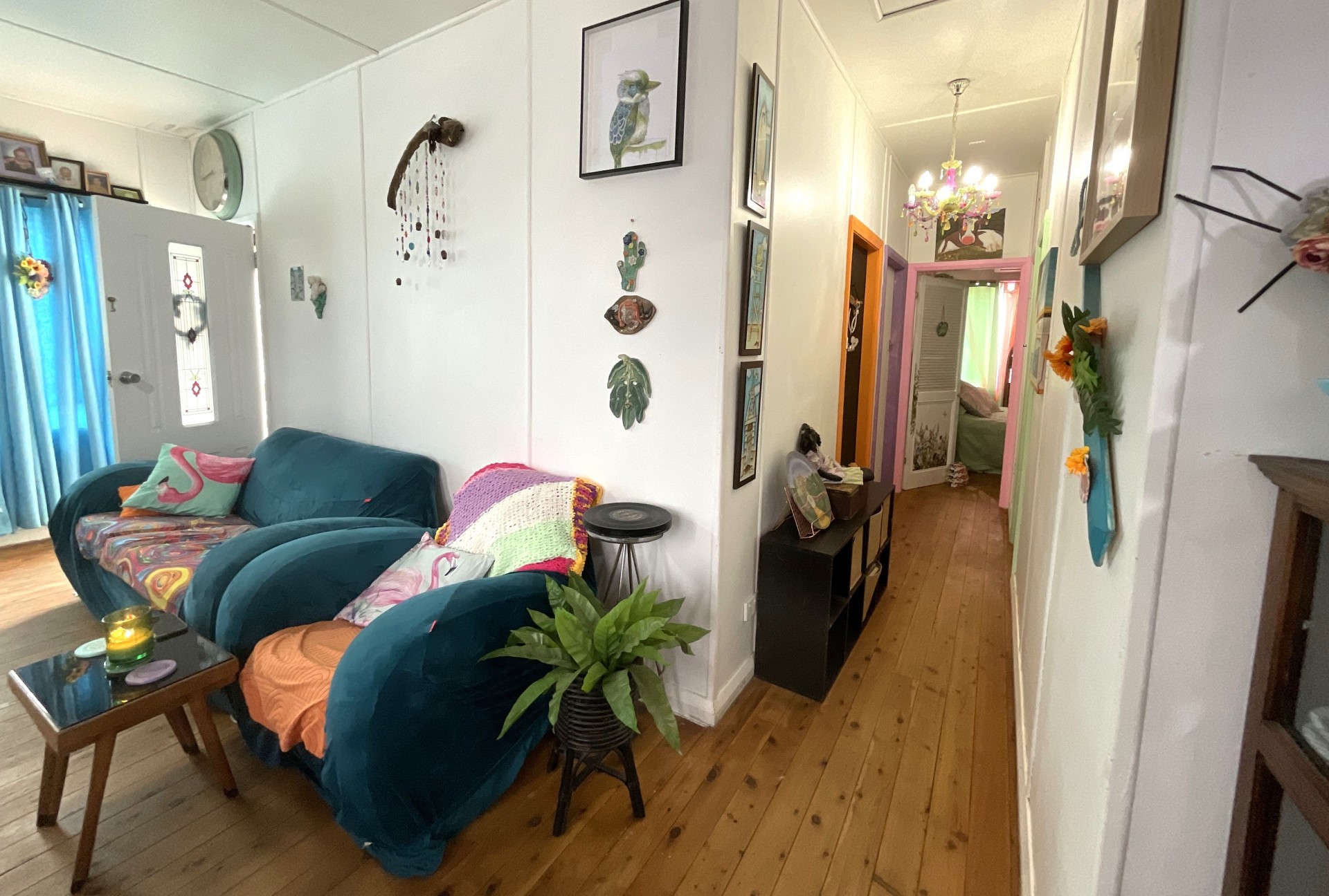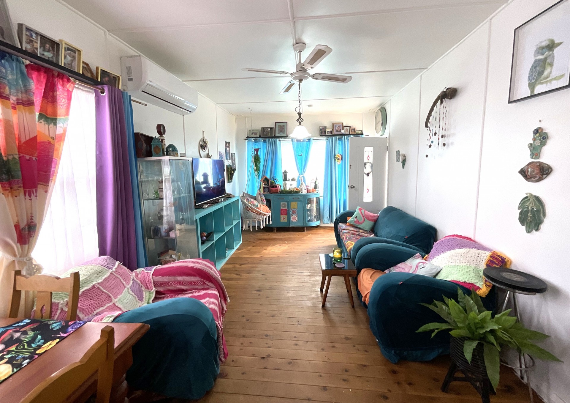 The home includes three bedrooms, two of which feature built-in wardrobes. There are two separate living areas, complemented by two split system air conditioners and ceiling fans to keep you comfortable year-round. The laundry retains its original charm with an old cement wash basin, adding a nostalgic touch.